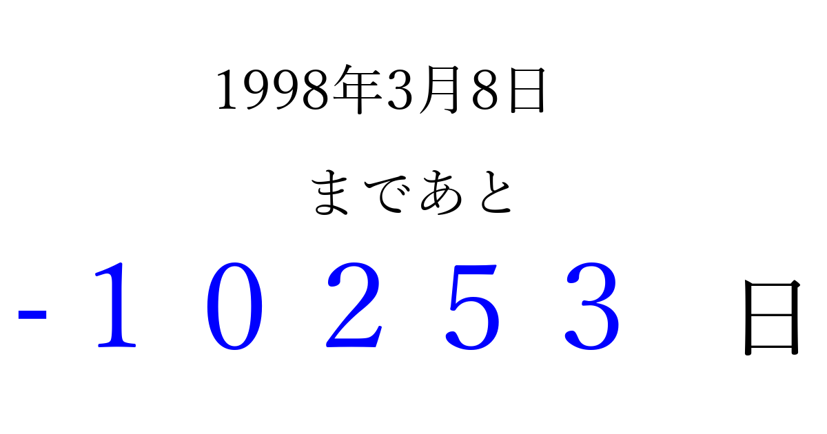 1998年3月8日(日)は もう 00000 日過ぎました 追加すると、トップページからすぐ選べるようになります ※2026/04/03現在の結果です。 最新の状態に更新する ↓シェアして、タイムライン上にカウントダウンを表示しよう!↓ 📤 この結果を共有する Tweet シェア Threads Bluesky 別の日付でカウントダウン 1998年3月のカレンダー このページをブックマークに追加すると、いつでもカウントダウンを確認できます。 (PC: Ctrl+D / Mac: ⌘+D) hitome-notes.comでは以下のページも運営しています。 指定日と期間から日付を計算 | ガチャ確率計算・シミュレーション | プライバシー・ポリシー 運営者:Avocado