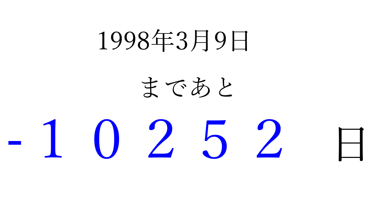 1998年3月9日(月)は もう 00000 日過ぎました 追加すると、トップページからすぐ選べるようになります ※2026/04/03現在の結果です。 最新の状態に更新する ↓シェアして、タイムライン上にカウントダウンを表示しよう!↓ 📤 この結果を共有する Tweet シェア Threads Bluesky 別の日付でカウントダウン 1998年3月のカレンダー このページをブックマークに追加すると、いつでもカウントダウンを確認できます。 (PC: Ctrl+D / Mac: ⌘+D) hitome-notes.comでは以下のページも運営しています。 指定日と期間から日付を計算 | ガチャ確率計算・シミュレーション | プライバシー・ポリシー 運営者:Avocado