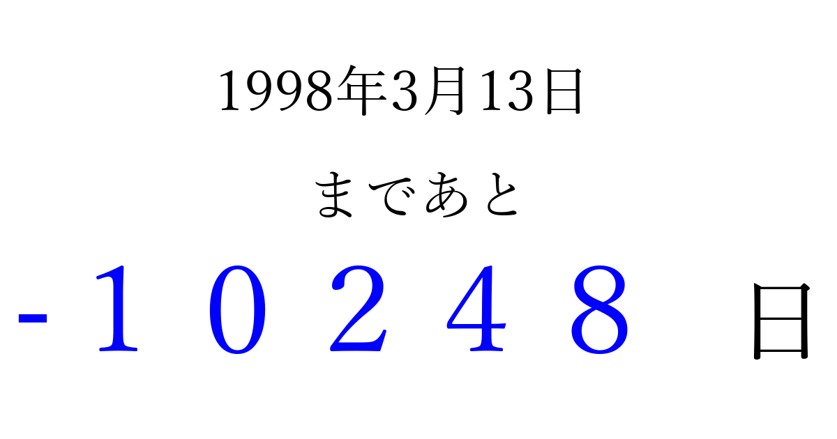 1998年3月13日(金)は もう 00000 日過ぎました 追加すると、トップページからすぐ選べるようになります ※2026/04/03現在の結果です。 最新の状態に更新する ↓シェアして、タイムライン上にカウントダウンを表示しよう!↓ 📤 この結果を共有する Tweet シェア Threads Bluesky 別の日付でカウントダウン 1998年3月のカレンダー このページをブックマークに追加すると、いつでもカウントダウンを確認できます。 (PC: Ctrl+D / Mac: ⌘+D) hitome-notes.comでは以下のページも運営しています。 指定日と期間から日付を計算 | ガチャ確率計算・シミュレーション | プライバシー・ポリシー 運営者:Avocado