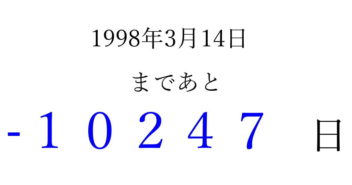 1998年3月14日(土)は もう 00000 日過ぎました 追加すると、トップページからすぐ選べるようになります ※2026/04/03現在の結果です。 最新の状態に更新する ↓シェアして、タイムライン上にカウントダウンを表示しよう!↓ 📤 この結果を共有する Tweet シェア Threads Bluesky 別の日付でカウントダウン 1998年3月のカレンダー このページをブックマークに追加すると、いつでもカウントダウンを確認できます。 (PC: Ctrl+D / Mac: ⌘+D) hitome-notes.comでは以下のページも運営しています。 指定日と期間から日付を計算 | ガチャ確率計算・シミュレーション | プライバシー・ポリシー 運営者:Avocado