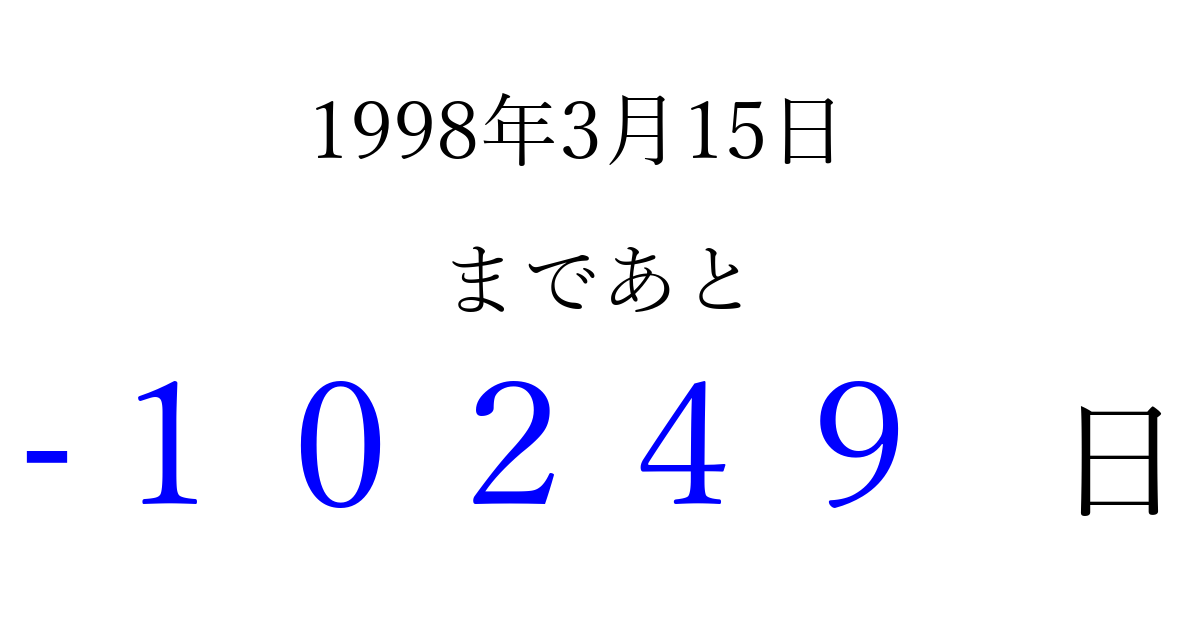 1998年3月15日(日)は もう 00000 日過ぎました 追加すると、トップページからすぐ選べるようになります ※2026/04/06現在の結果です。 最新の状態に更新する ↓シェアして、タイムライン上にカウントダウンを表示しよう!↓ 📤 この結果を共有する Tweet シェア Threads Bluesky 別の日付でカウントダウン 1998年3月のカレンダー このページをブックマークに追加すると、いつでもカウントダウンを確認できます。 (PC: Ctrl+D / Mac: ⌘+D) hitome-notes.comでは以下のページも運営しています。 指定日と期間から日付を計算 | ガチャ確率計算・シミュレーション | プライバシー・ポリシー 運営者:Avocado