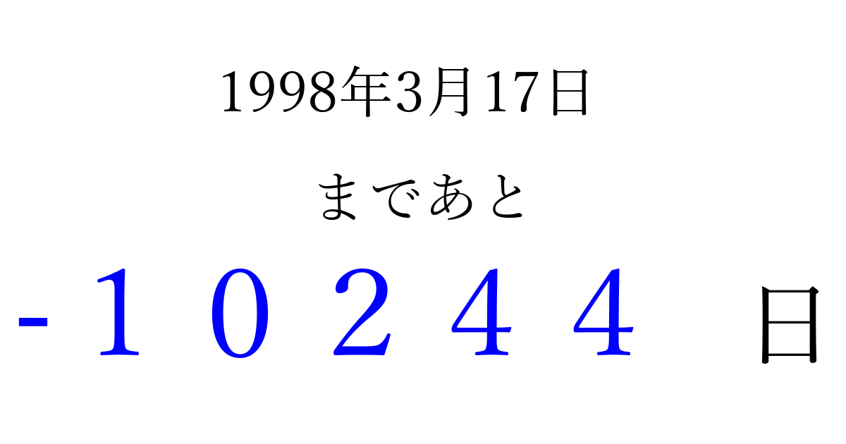 1998年3月17日(火)は もう 00000 日過ぎました 追加すると、トップページからすぐ選べるようになります ※2026/04/03現在の結果です。 最新の状態に更新する ↓シェアして、タイムライン上にカウントダウンを表示しよう!↓ 📤 この結果を共有する Tweet シェア Threads Bluesky 別の日付でカウントダウン 1998年3月のカレンダー このページをブックマークに追加すると、いつでもカウントダウンを確認できます。 (PC: Ctrl+D / Mac: ⌘+D) hitome-notes.comでは以下のページも運営しています。 指定日と期間から日付を計算 | ガチャ確率計算・シミュレーション | プライバシー・ポリシー 運営者:Avocado