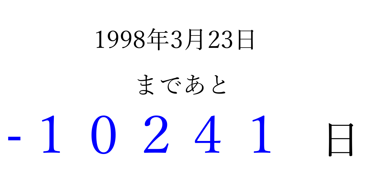1998年3月23日(月)は もう 00000 日過ぎました 追加すると、トップページからすぐ選べるようになります ※2026/04/06現在の結果です。 最新の状態に更新する ↓シェアして、タイムライン上にカウントダウンを表示しよう!↓ 📤 この結果を共有する Tweet シェア Threads Bluesky 別の日付でカウントダウン 1998年3月のカレンダー このページをブックマークに追加すると、いつでもカウントダウンを確認できます。 (PC: Ctrl+D / Mac: ⌘+D) hitome-notes.comでは以下のページも運営しています。 指定日と期間から日付を計算 | ガチャ確率計算・シミュレーション | プライバシー・ポリシー 運営者:Avocado