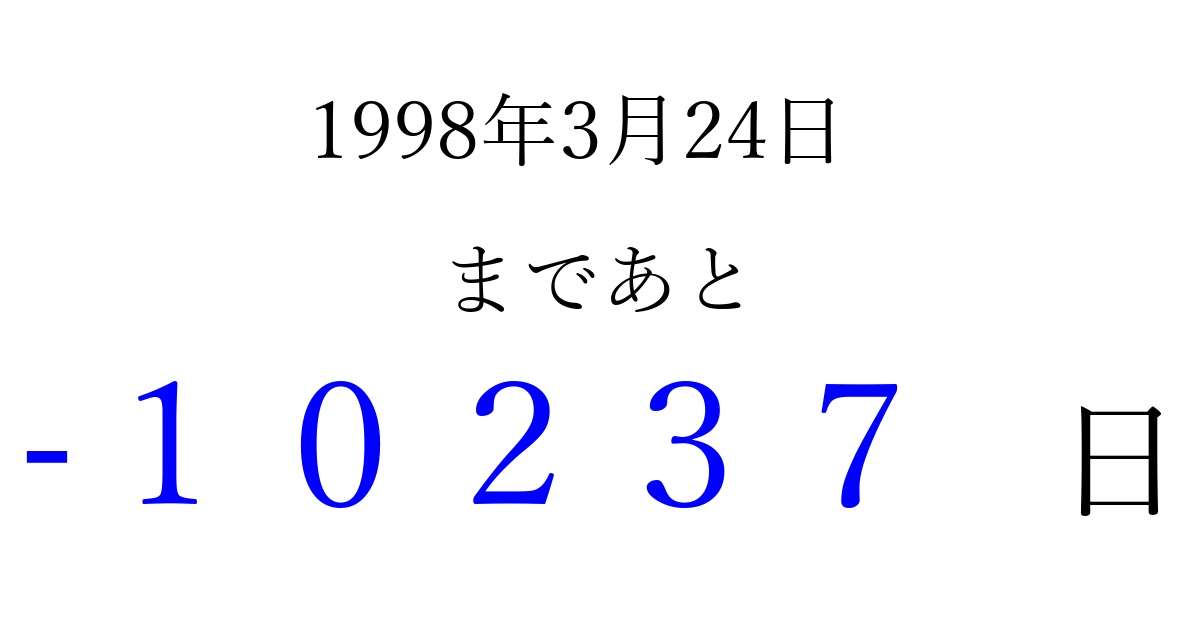 1998年3月24日(火)は もう 00000 日過ぎました 追加すると、トップページからすぐ選べるようになります ※2026/04/03現在の結果です。 最新の状態に更新する ↓シェアして、タイムライン上にカウントダウンを表示しよう!↓ 📤 この結果を共有する Tweet シェア Threads Bluesky 別の日付でカウントダウン 1998年3月のカレンダー このページをブックマークに追加すると、いつでもカウントダウンを確認できます。 (PC: Ctrl+D / Mac: ⌘+D) hitome-notes.comでは以下のページも運営しています。 指定日と期間から日付を計算 | ガチャ確率計算・シミュレーション | プライバシー・ポリシー 運営者:Avocado