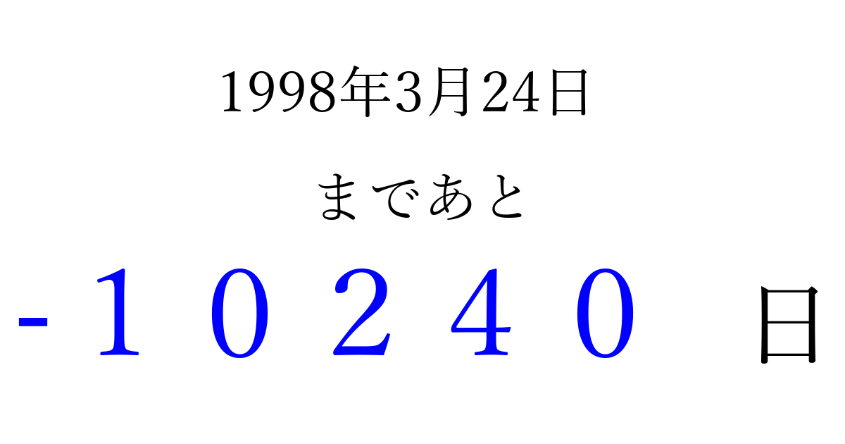 1998年3月24日(火)は もう 00000 日過ぎました 追加すると、トップページからすぐ選べるようになります ※2026/04/06現在の結果です。 最新の状態に更新する ↓シェアして、タイムライン上にカウントダウンを表示しよう!↓ 📤 この結果を共有する Tweet シェア Threads Bluesky 別の日付でカウントダウン 1998年3月のカレンダー このページをブックマークに追加すると、いつでもカウントダウンを確認できます。 (PC: Ctrl+D / Mac: ⌘+D) hitome-notes.comでは以下のページも運営しています。 指定日と期間から日付を計算 | ガチャ確率計算・シミュレーション | プライバシー・ポリシー 運営者:Avocado