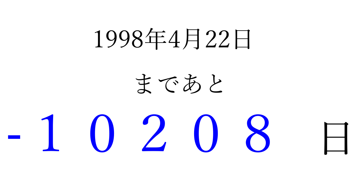 1998年4月22日(水)は もう 00000 日過ぎました 追加すると、トップページからすぐ選べるようになります ※2026/04/03現在の結果です。 最新の状態に更新する ↓シェアして、タイムライン上にカウントダウンを表示しよう!↓ 📤 この結果を共有する Tweet シェア Threads Bluesky 別の日付でカウントダウン 1998年4月のカレンダー このページをブックマークに追加すると、いつでもカウントダウンを確認できます。 (PC: Ctrl+D / Mac: ⌘+D) hitome-notes.comでは以下のページも運営しています。 指定日と期間から日付を計算 | ガチャ確率計算・シミュレーション | プライバシー・ポリシー 運営者:Avocado