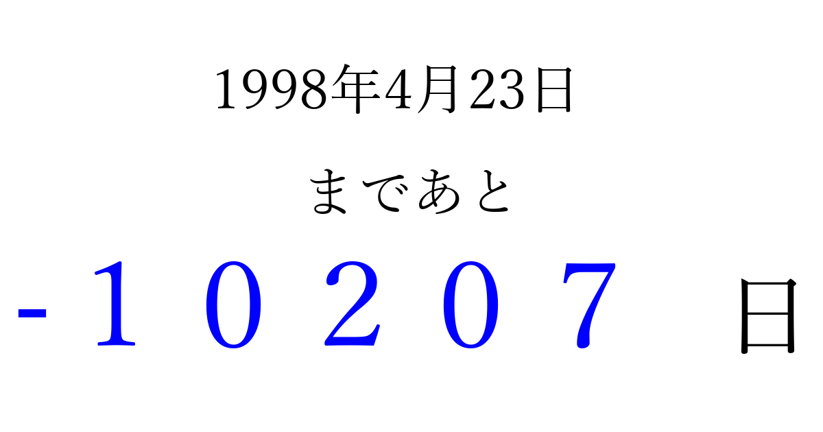 1998年4月23日(木)は もう 00000 日過ぎました 追加すると、トップページからすぐ選べるようになります ※2026/04/03現在の結果です。 最新の状態に更新する ↓シェアして、タイムライン上にカウントダウンを表示しよう!↓ 📤 この結果を共有する Tweet シェア Threads Bluesky 別の日付でカウントダウン 1998年4月のカレンダー このページをブックマークに追加すると、いつでもカウントダウンを確認できます。 (PC: Ctrl+D / Mac: ⌘+D) hitome-notes.comでは以下のページも運営しています。 指定日と期間から日付を計算 | ガチャ確率計算・シミュレーション | プライバシー・ポリシー 運営者:Avocado