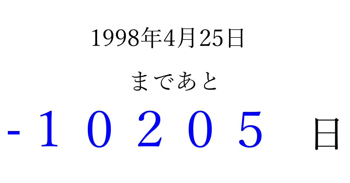 1998年4月25日(土)は もう 00000 日過ぎました 追加すると、トップページからすぐ選べるようになります ※2026/04/03現在の結果です。 最新の状態に更新する ↓シェアして、タイムライン上にカウントダウンを表示しよう!↓ 📤 この結果を共有する Tweet シェア Threads Bluesky 別の日付でカウントダウン 1998年4月のカレンダー このページをブックマークに追加すると、いつでもカウントダウンを確認できます。 (PC: Ctrl+D / Mac: ⌘+D) hitome-notes.comでは以下のページも運営しています。 指定日と期間から日付を計算 | ガチャ確率計算・シミュレーション | プライバシー・ポリシー 運営者:Avocado