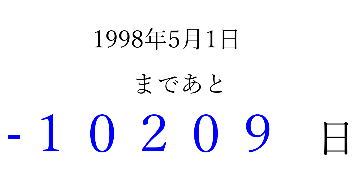 1998年5月1日(金)は もう 00000 日過ぎました 追加すると、トップページからすぐ選べるようになります ※2026/04/13現在の結果です。 最新の状態に更新する ↓シェアして、タイムライン上にカウントダウンを表示しよう!↓ 📤 この結果を共有する Tweet シェア Threads Bluesky 別の日付でカウントダウン 1998年5月のカレンダー このページをブックマークに追加すると、いつでもカウントダウンを確認できます。 (PC: Ctrl+D / Mac: ⌘+D) hitome-notes.comでは以下のページも運営しています。 指定日と期間から日付を計算 | ガチャ確率計算・シミュレーション | プライバシー・ポリシー 運営者:Avocado