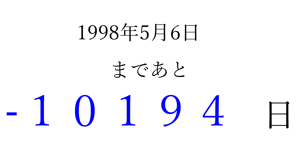 1998年5月6日(水)は もう 00000 日過ぎました 追加すると、トップページからすぐ選べるようになります ※2026/04/03現在の結果です。 最新の状態に更新する ↓シェアして、タイムライン上にカウントダウンを表示しよう!↓ 📤 この結果を共有する Tweet シェア Threads Bluesky 別の日付でカウントダウン 1998年5月のカレンダー このページをブックマークに追加すると、いつでもカウントダウンを確認できます。 (PC: Ctrl+D / Mac: ⌘+D) hitome-notes.comでは以下のページも運営しています。 指定日と期間から日付を計算 | ガチャ確率計算・シミュレーション | プライバシー・ポリシー 運営者:Avocado