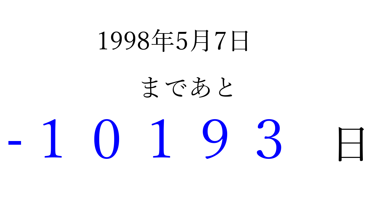 1998年5月7日(木)は もう 00000 日過ぎました 追加すると、トップページからすぐ選べるようになります ※2026/04/03現在の結果です。 最新の状態に更新する ↓シェアして、タイムライン上にカウントダウンを表示しよう!↓ 📤 この結果を共有する Tweet シェア Threads Bluesky 別の日付でカウントダウン 1998年5月のカレンダー このページをブックマークに追加すると、いつでもカウントダウンを確認できます。 (PC: Ctrl+D / Mac: ⌘+D) hitome-notes.comでは以下のページも運営しています。 指定日と期間から日付を計算 | ガチャ確率計算・シミュレーション | プライバシー・ポリシー 運営者:Avocado