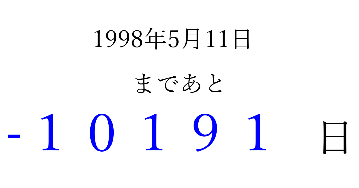 1998年5月11日(月)は もう 00000 日過ぎました 追加すると、トップページからすぐ選べるようになります ※2026/04/05現在の結果です。 最新の状態に更新する ↓シェアして、タイムライン上にカウントダウンを表示しよう!↓ 📤 この結果を共有する Tweet シェア Threads Bluesky 別の日付でカウントダウン 1998年5月のカレンダー このページをブックマークに追加すると、いつでもカウントダウンを確認できます。 (PC: Ctrl+D / Mac: ⌘+D) hitome-notes.comでは以下のページも運営しています。 指定日と期間から日付を計算 | ガチャ確率計算・シミュレーション | プライバシー・ポリシー 運営者:Avocado