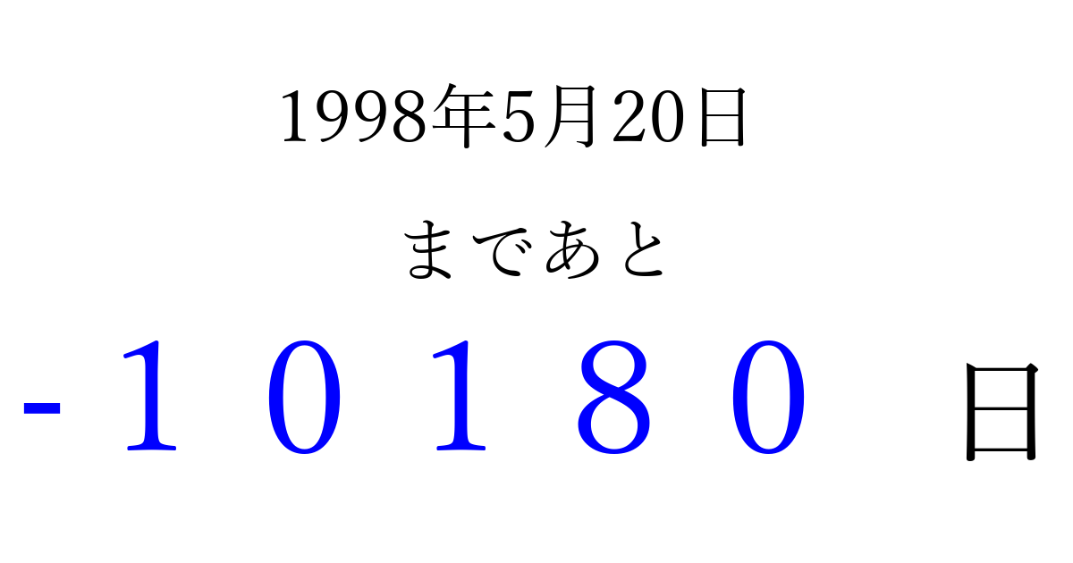 1998年5月20日(水)は もう 00000 日過ぎました 追加すると、トップページからすぐ選べるようになります ※2026/04/03現在の結果です。 最新の状態に更新する ↓シェアして、タイムライン上にカウントダウンを表示しよう!↓ 📤 この結果を共有する Tweet シェア Threads Bluesky 別の日付でカウントダウン 1998年5月のカレンダー このページをブックマークに追加すると、いつでもカウントダウンを確認できます。 (PC: Ctrl+D / Mac: ⌘+D) hitome-notes.comでは以下のページも運営しています。 指定日と期間から日付を計算 | ガチャ確率計算・シミュレーション | プライバシー・ポリシー 運営者:Avocado