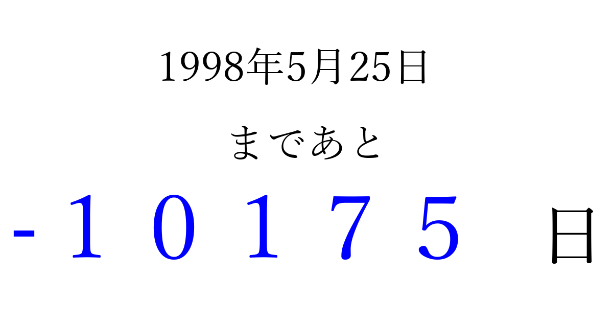 1998年5月25日(月)は もう 00000 日過ぎました 追加すると、トップページからすぐ選べるようになります ※2026/04/03現在の結果です。 最新の状態に更新する ↓シェアして、タイムライン上にカウントダウンを表示しよう!↓ 📤 この結果を共有する Tweet シェア Threads Bluesky 別の日付でカウントダウン 1998年5月のカレンダー このページをブックマークに追加すると、いつでもカウントダウンを確認できます。 (PC: Ctrl+D / Mac: ⌘+D) hitome-notes.comでは以下のページも運営しています。 指定日と期間から日付を計算 | ガチャ確率計算・シミュレーション | プライバシー・ポリシー 運営者:Avocado