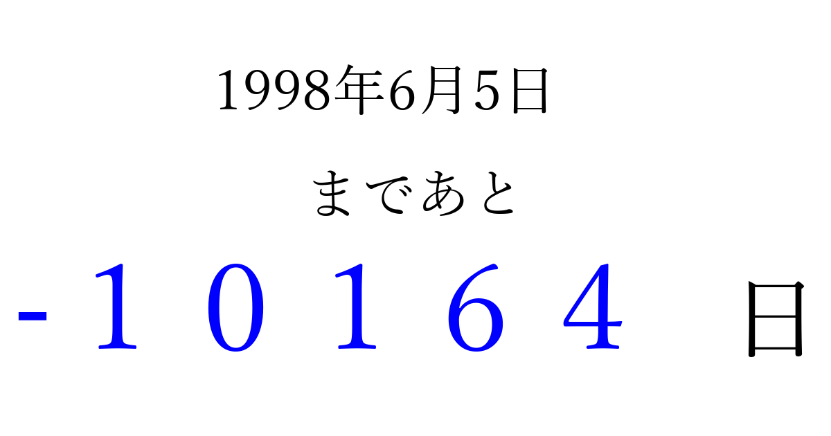 1998年6月5日(金)は もう 00000 日過ぎました 追加すると、トップページからすぐ選べるようになります ※2026/04/03現在の結果です。 最新の状態に更新する ↓シェアして、タイムライン上にカウントダウンを表示しよう!↓ 📤 この結果を共有する Tweet シェア Threads Bluesky 別の日付でカウントダウン 1998年6月のカレンダー このページをブックマークに追加すると、いつでもカウントダウンを確認できます。 (PC: Ctrl+D / Mac: ⌘+D) hitome-notes.comでは以下のページも運営しています。 指定日と期間から日付を計算 | ガチャ確率計算・シミュレーション | プライバシー・ポリシー 運営者:Avocado
