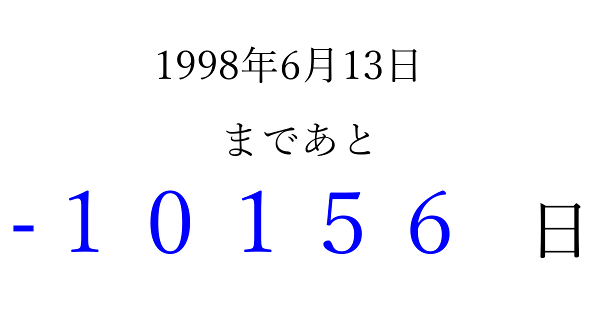 1998年6月13日(土)は もう 00000 日過ぎました 追加すると、トップページからすぐ選べるようになります ※2026/04/03現在の結果です。 最新の状態に更新する ↓シェアして、タイムライン上にカウントダウンを表示しよう!↓ 📤 この結果を共有する Tweet シェア Threads Bluesky 別の日付でカウントダウン 1998年6月のカレンダー このページをブックマークに追加すると、いつでもカウントダウンを確認できます。 (PC: Ctrl+D / Mac: ⌘+D) hitome-notes.comでは以下のページも運営しています。 指定日と期間から日付を計算 | ガチャ確率計算・シミュレーション | プライバシー・ポリシー 運営者:Avocado