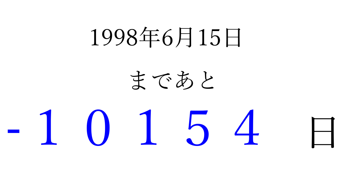 1998年6月15日(月)は もう 00000 日過ぎました 追加すると、トップページからすぐ選べるようになります ※2026/04/03現在の結果です。 最新の状態に更新する ↓シェアして、タイムライン上にカウントダウンを表示しよう!↓ 📤 この結果を共有する Tweet シェア Threads Bluesky 別の日付でカウントダウン 1998年6月のカレンダー このページをブックマークに追加すると、いつでもカウントダウンを確認できます。 (PC: Ctrl+D / Mac: ⌘+D) hitome-notes.comでは以下のページも運営しています。 指定日と期間から日付を計算 | ガチャ確率計算・シミュレーション | プライバシー・ポリシー 運営者:Avocado
