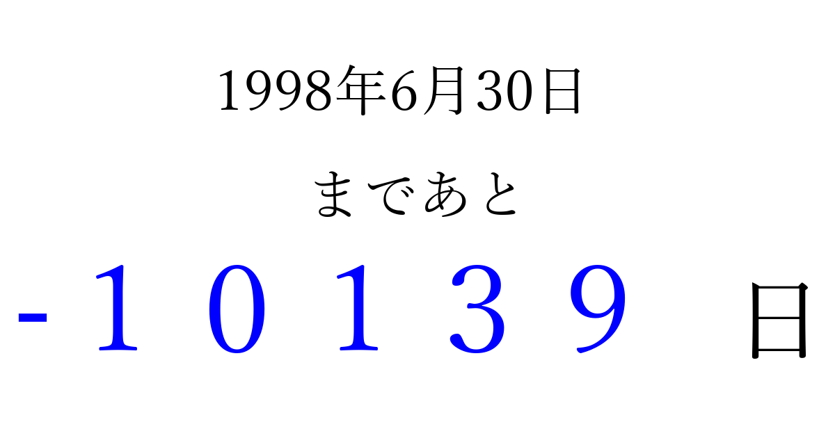 1998年6月30日(火)は もう 00000 日過ぎました 追加すると、トップページからすぐ選べるようになります ※2026/04/03現在の結果です。 最新の状態に更新する ↓シェアして、タイムライン上にカウントダウンを表示しよう!↓ 📤 この結果を共有する Tweet シェア Threads Bluesky 別の日付でカウントダウン 1998年6月のカレンダー このページをブックマークに追加すると、いつでもカウントダウンを確認できます。 (PC: Ctrl+D / Mac: ⌘+D) hitome-notes.comでは以下のページも運営しています。 指定日と期間から日付を計算 | ガチャ確率計算・シミュレーション | プライバシー・ポリシー 運営者:Avocado