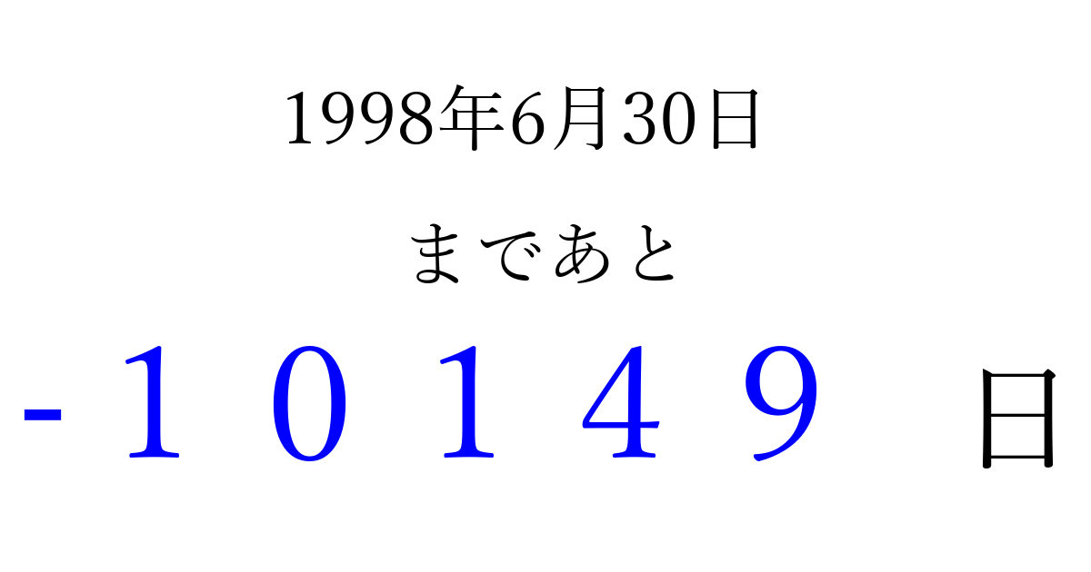 1998年6月30日(火)は もう 00000 日過ぎました 追加すると、トップページからすぐ選べるようになります ※2026/04/13現在の結果です。 最新の状態に更新する ↓シェアして、タイムライン上にカウントダウンを表示しよう!↓ 📤 この結果を共有する Tweet シェア Threads Bluesky 別の日付でカウントダウン 1998年6月のカレンダー このページをブックマークに追加すると、いつでもカウントダウンを確認できます。 (PC: Ctrl+D / Mac: ⌘+D) hitome-notes.comでは以下のページも運営しています。 指定日と期間から日付を計算 | ガチャ確率計算・シミュレーション | プライバシー・ポリシー 運営者:Avocado