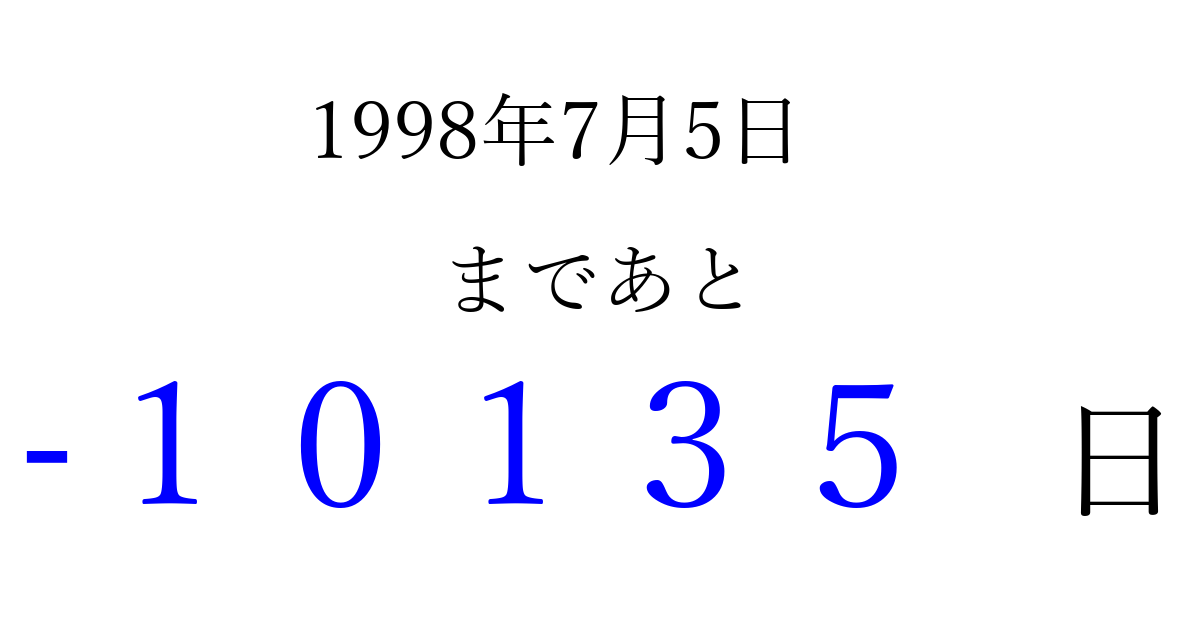 1998年7月5日(日)は もう 00000 日過ぎました 追加すると、トップページからすぐ選べるようになります ※2026/04/04現在の結果です。 最新の状態に更新する ↓シェアして、タイムライン上にカウントダウンを表示しよう!↓ 📤 この結果を共有する Tweet シェア Threads Bluesky 別の日付でカウントダウン 1998年7月のカレンダー このページをブックマークに追加すると、いつでもカウントダウンを確認できます。 (PC: Ctrl+D / Mac: ⌘+D) hitome-notes.comでは以下のページも運営しています。 指定日と期間から日付を計算 | ガチャ確率計算・シミュレーション | プライバシー・ポリシー 運営者:Avocado