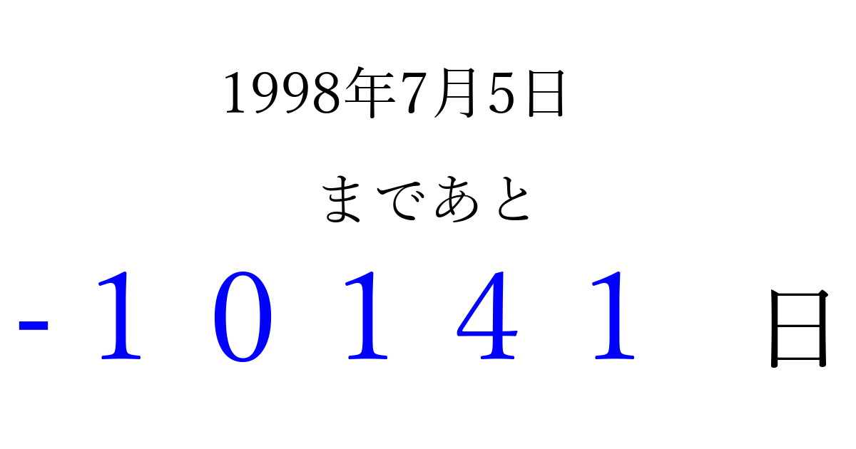 1998年7月5日(日)は もう 00000 日過ぎました 追加すると、トップページからすぐ選べるようになります ※2026/04/10現在の結果です。 最新の状態に更新する ↓シェアして、タイムライン上にカウントダウンを表示しよう!↓ 📤 この結果を共有する Tweet シェア Threads Bluesky 別の日付でカウントダウン 1998年7月のカレンダー このページをブックマークに追加すると、いつでもカウントダウンを確認できます。 (PC: Ctrl+D / Mac: ⌘+D) hitome-notes.comでは以下のページも運営しています。 指定日と期間から日付を計算 | ガチャ確率計算・シミュレーション | プライバシー・ポリシー 運営者:Avocado