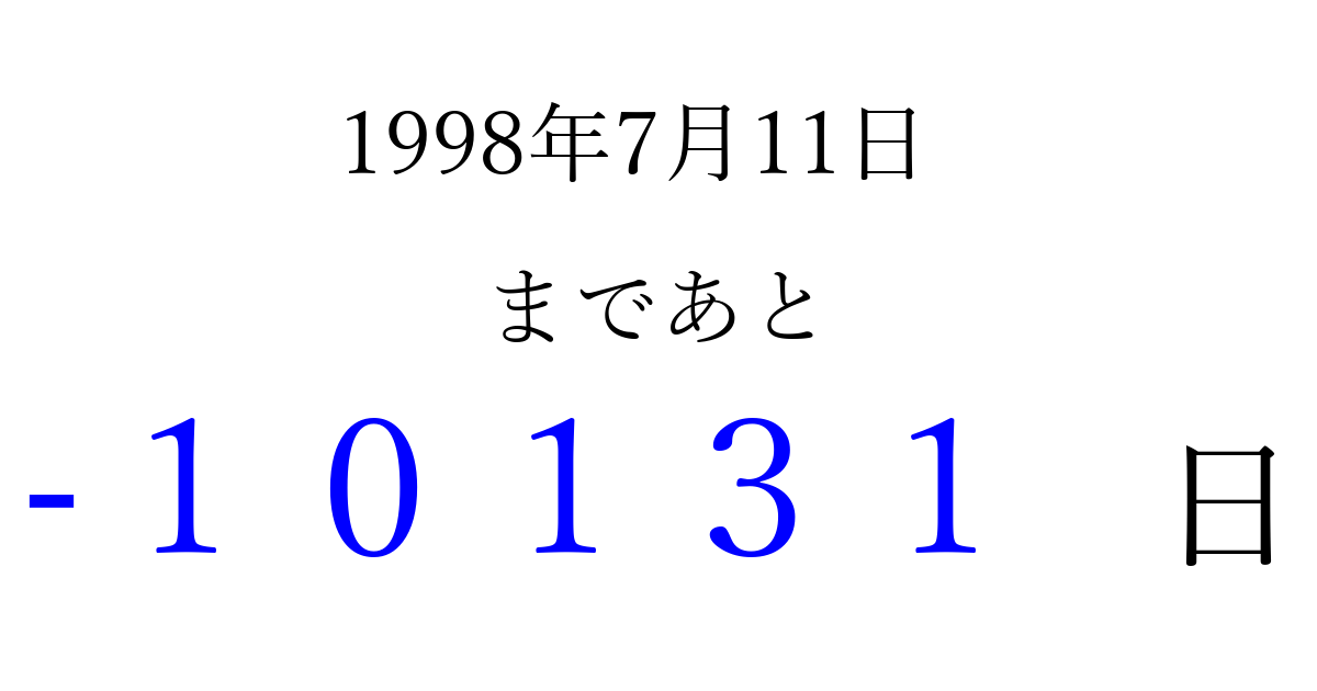 1998年7月11日(土)は もう 00000 日過ぎました 追加すると、トップページからすぐ選べるようになります ※2026/04/06現在の結果です。 最新の状態に更新する ↓シェアして、タイムライン上にカウントダウンを表示しよう!↓ 📤 この結果を共有する Tweet シェア Threads Bluesky 別の日付でカウントダウン 1998年7月のカレンダー このページをブックマークに追加すると、いつでもカウントダウンを確認できます。 (PC: Ctrl+D / Mac: ⌘+D) hitome-notes.comでは以下のページも運営しています。 指定日と期間から日付を計算 | ガチャ確率計算・シミュレーション | プライバシー・ポリシー 運営者:Avocado