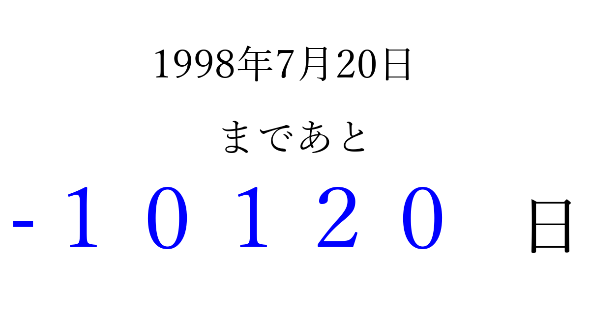 1998年7月20日(月)は もう 00000 日過ぎました 追加すると、トップページからすぐ選べるようになります ※2026/04/04現在の結果です。 最新の状態に更新する ↓シェアして、タイムライン上にカウントダウンを表示しよう!↓ 📤 この結果を共有する Tweet シェア Threads Bluesky 別の日付でカウントダウン 1998年7月のカレンダー このページをブックマークに追加すると、いつでもカウントダウンを確認できます。 (PC: Ctrl+D / Mac: ⌘+D) hitome-notes.comでは以下のページも運営しています。 指定日と期間から日付を計算 | ガチャ確率計算・シミュレーション | プライバシー・ポリシー 運営者:Avocado