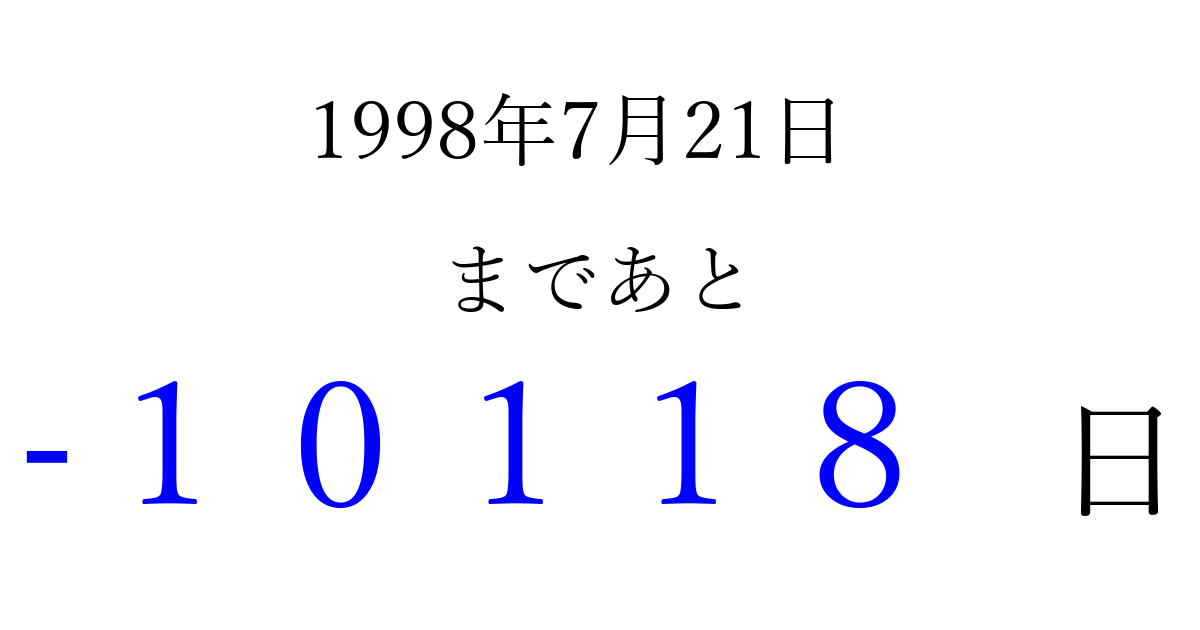1998年7月21日(火)は もう 00000 日過ぎました 追加すると、トップページからすぐ選べるようになります ※2026/04/03現在の結果です。 最新の状態に更新する ↓シェアして、タイムライン上にカウントダウンを表示しよう!↓ 📤 この結果を共有する Tweet シェア Threads Bluesky 別の日付でカウントダウン 1998年7月のカレンダー このページをブックマークに追加すると、いつでもカウントダウンを確認できます。 (PC: Ctrl+D / Mac: ⌘+D) hitome-notes.comでは以下のページも運営しています。 指定日と期間から日付を計算 | ガチャ確率計算・シミュレーション | プライバシー・ポリシー 運営者:Avocado