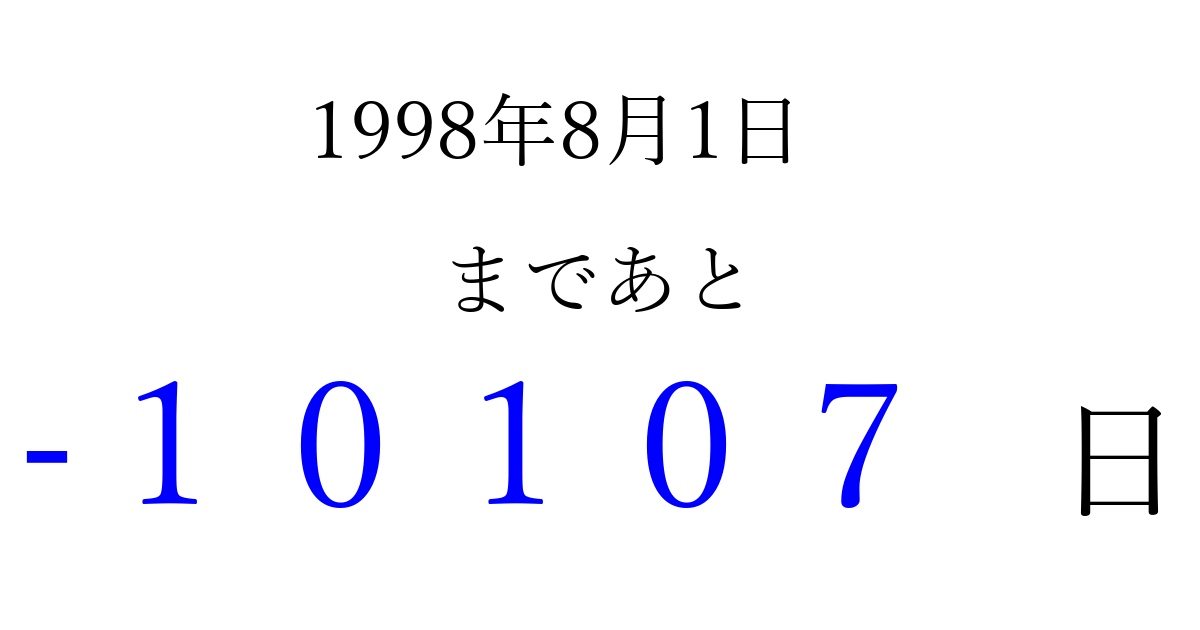 1998年8月1日(土)は もう 00000 日過ぎました 追加すると、トップページからすぐ選べるようになります ※2026/04/03現在の結果です。 最新の状態に更新する ↓シェアして、タイムライン上にカウントダウンを表示しよう!↓ 📤 この結果を共有する Tweet シェア Threads Bluesky 別の日付でカウントダウン 1998年8月のカレンダー このページをブックマークに追加すると、いつでもカウントダウンを確認できます。 (PC: Ctrl+D / Mac: ⌘+D) hitome-notes.comでは以下のページも運営しています。 指定日と期間から日付を計算 | ガチャ確率計算・シミュレーション | プライバシー・ポリシー 運営者:Avocado
