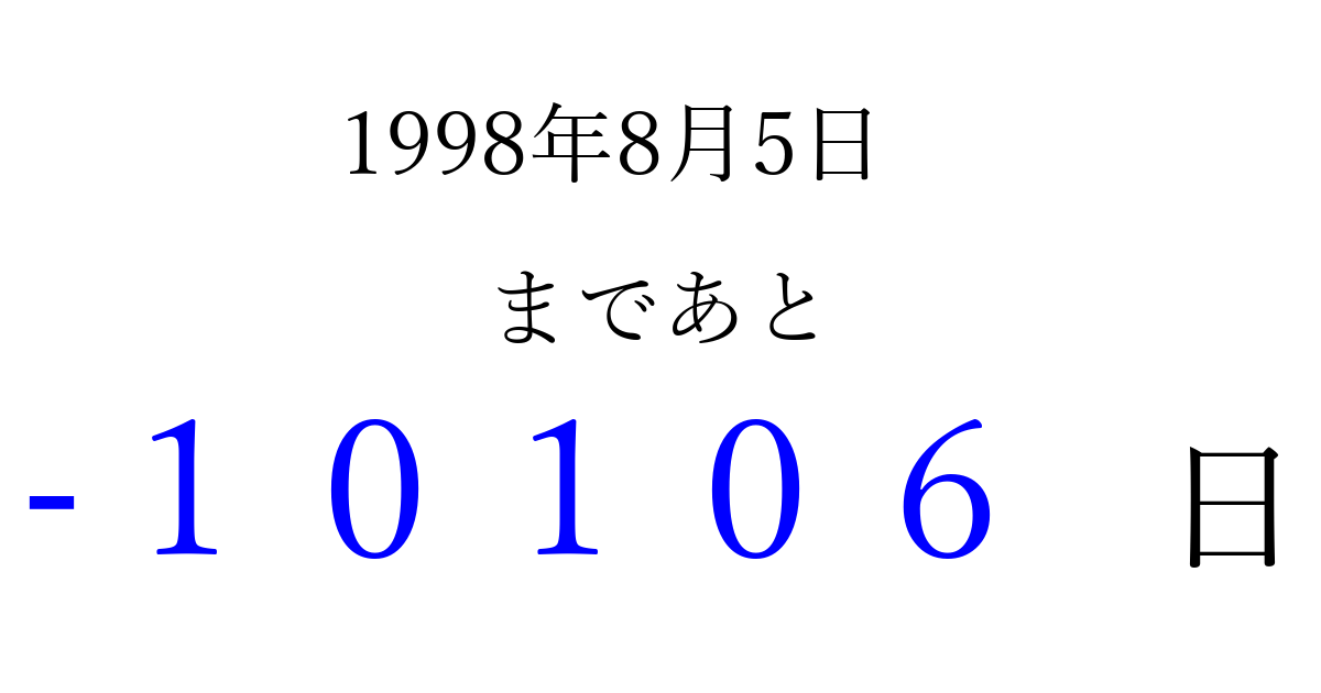 1998年8月5日(水)は もう 00000 日過ぎました 追加すると、トップページからすぐ選べるようになります ※2026/04/06現在の結果です。 最新の状態に更新する ↓シェアして、タイムライン上にカウントダウンを表示しよう!↓ 📤 この結果を共有する Tweet シェア Threads Bluesky 別の日付でカウントダウン 1998年8月のカレンダー このページをブックマークに追加すると、いつでもカウントダウンを確認できます。 (PC: Ctrl+D / Mac: ⌘+D) hitome-notes.comでは以下のページも運営しています。 指定日と期間から日付を計算 | ガチャ確率計算・シミュレーション | プライバシー・ポリシー 運営者:Avocado