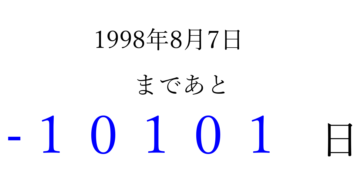 1998年8月7日(金)は もう 00000 日過ぎました 追加すると、トップページからすぐ選べるようになります ※2026/04/03現在の結果です。 最新の状態に更新する ↓シェアして、タイムライン上にカウントダウンを表示しよう!↓ 📤 この結果を共有する Tweet シェア Threads Bluesky 別の日付でカウントダウン 1998年8月のカレンダー このページをブックマークに追加すると、いつでもカウントダウンを確認できます。 (PC: Ctrl+D / Mac: ⌘+D) hitome-notes.comでは以下のページも運営しています。 指定日と期間から日付を計算 | ガチャ確率計算・シミュレーション | プライバシー・ポリシー 運営者:Avocado