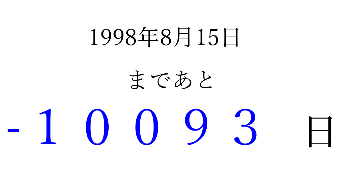 1998年8月15日(土)は もう 00000 日過ぎました 追加すると、トップページからすぐ選べるようになります ※2026/04/03現在の結果です。 最新の状態に更新する ↓シェアして、タイムライン上にカウントダウンを表示しよう!↓ 📤 この結果を共有する Tweet シェア Threads Bluesky 別の日付でカウントダウン 1998年8月のカレンダー このページをブックマークに追加すると、いつでもカウントダウンを確認できます。 (PC: Ctrl+D / Mac: ⌘+D) hitome-notes.comでは以下のページも運営しています。 指定日と期間から日付を計算 | ガチャ確率計算・シミュレーション | プライバシー・ポリシー 運営者:Avocado