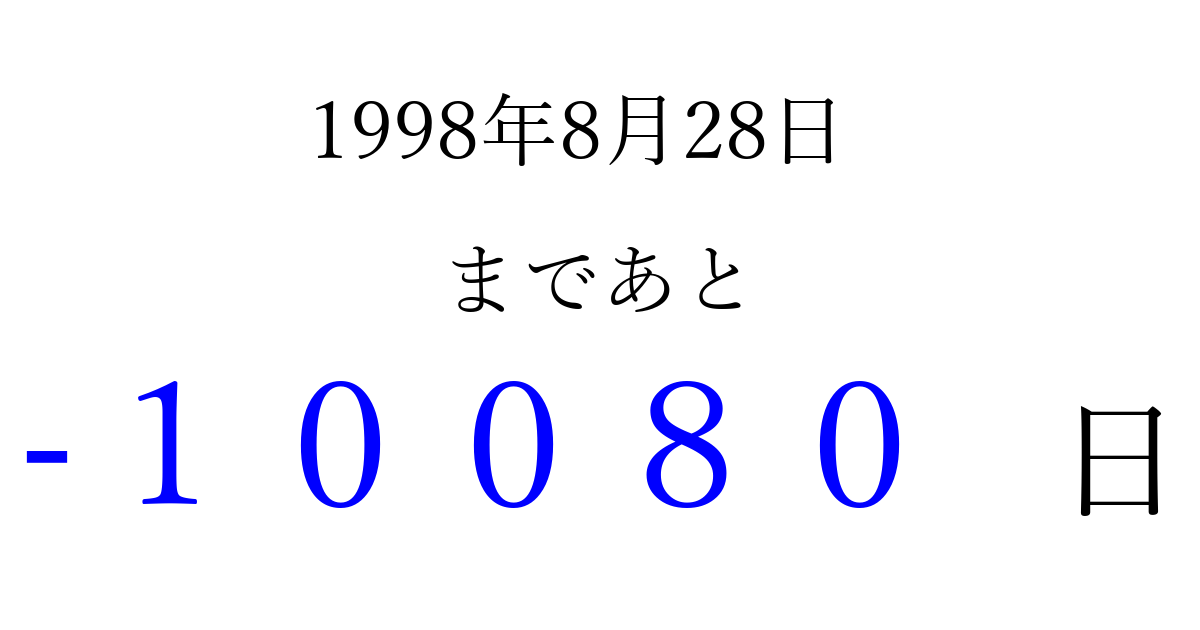 1998年8月28日(金)は もう 00000 日過ぎました 追加すると、トップページからすぐ選べるようになります ※2026/04/03現在の結果です。 最新の状態に更新する ↓シェアして、タイムライン上にカウントダウンを表示しよう!↓ 📤 この結果を共有する Tweet シェア Threads Bluesky 別の日付でカウントダウン 1998年8月のカレンダー このページをブックマークに追加すると、いつでもカウントダウンを確認できます。 (PC: Ctrl+D / Mac: ⌘+D) hitome-notes.comでは以下のページも運営しています。 指定日と期間から日付を計算 | ガチャ確率計算・シミュレーション | プライバシー・ポリシー 運営者:Avocado