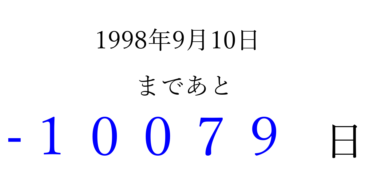 1998年9月10日(木)は もう 00000 日過ぎました 追加すると、トップページからすぐ選べるようになります ※2026/04/15現在の結果です。 最新の状態に更新する ↓シェアして、タイムライン上にカウントダウンを表示しよう!↓ 📤 この結果を共有する Tweet シェア Threads Bluesky 別の日付でカウントダウン 1998年9月のカレンダー このページをブックマークに追加すると、いつでもカウントダウンを確認できます。 (PC: Ctrl+D / Mac: ⌘+D) hitome-notes.comでは以下のページも運営しています。 指定日と期間から日付を計算 | ガチャ確率計算・シミュレーション | プライバシー・ポリシー 運営者:Avocado