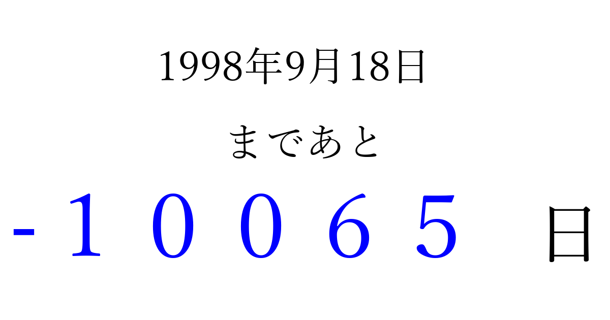 1998年9月18日(金)は もう 00000 日過ぎました 追加すると、トップページからすぐ選べるようになります ※2026/04/09現在の結果です。 最新の状態に更新する ↓シェアして、タイムライン上にカウントダウンを表示しよう!↓ 📤 この結果を共有する Tweet シェア Threads Bluesky 別の日付でカウントダウン 1998年9月のカレンダー このページをブックマークに追加すると、いつでもカウントダウンを確認できます。 (PC: Ctrl+D / Mac: ⌘+D) hitome-notes.comでは以下のページも運営しています。 指定日と期間から日付を計算 | ガチャ確率計算・シミュレーション | プライバシー・ポリシー 運営者:Avocado