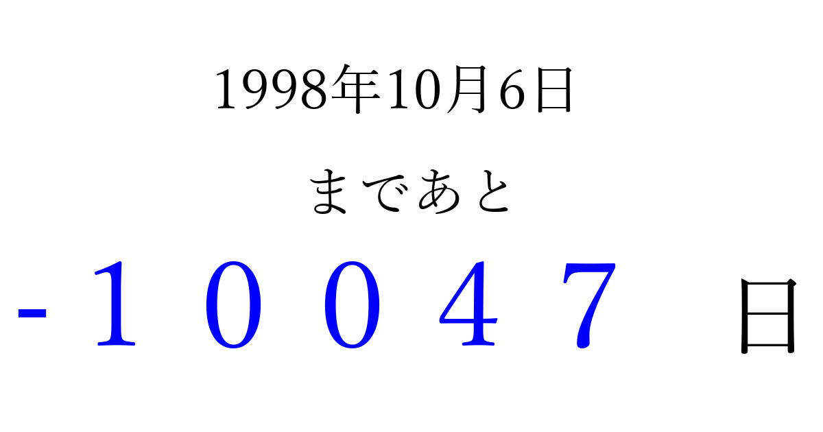 1998年10月6日(火)は もう 00000 日過ぎました 追加すると、トップページからすぐ選べるようになります ※2026/04/09現在の結果です。 最新の状態に更新する ↓シェアして、タイムライン上にカウントダウンを表示しよう!↓ 📤 この結果を共有する Tweet シェア Threads Bluesky 別の日付でカウントダウン 1998年10月のカレンダー このページをブックマークに追加すると、いつでもカウントダウンを確認できます。 (PC: Ctrl+D / Mac: ⌘+D) hitome-notes.comでは以下のページも運営しています。 指定日と期間から日付を計算 | ガチャ確率計算・シミュレーション | プライバシー・ポリシー 運営者:Avocado