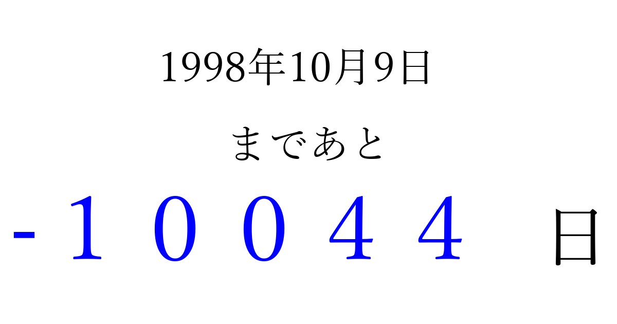 1998年10月9日(金)は もう 00000 日過ぎました 追加すると、トップページからすぐ選べるようになります ※2026/04/09現在の結果です。 最新の状態に更新する ↓シェアして、タイムライン上にカウントダウンを表示しよう!↓ 📤 この結果を共有する Tweet シェア Threads Bluesky 別の日付でカウントダウン 1998年10月のカレンダー このページをブックマークに追加すると、いつでもカウントダウンを確認できます。 (PC: Ctrl+D / Mac: ⌘+D) hitome-notes.comでは以下のページも運営しています。 指定日と期間から日付を計算 | ガチャ確率計算・シミュレーション | プライバシー・ポリシー 運営者:Avocado