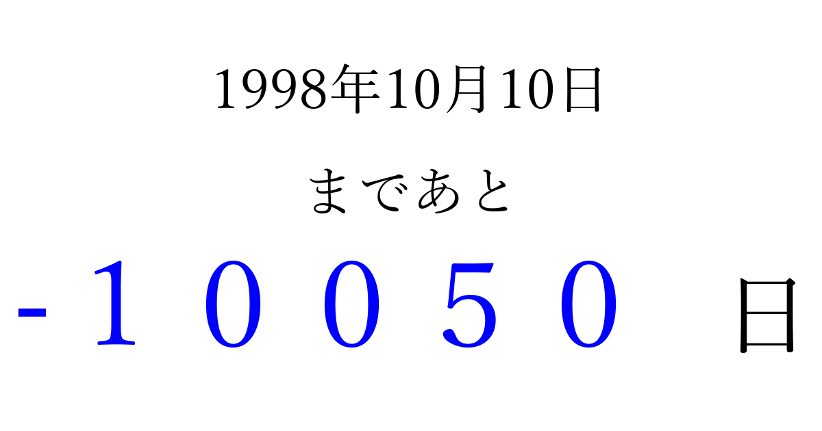 1998年10月10日(土)は もう 00000 日過ぎました 追加すると、トップページからすぐ選べるようになります ※2026/04/16現在の結果です。 最新の状態に更新する ↓シェアして、タイムライン上にカウントダウンを表示しよう!↓ 📤 この結果を共有する Tweet シェア Threads Bluesky 別の日付でカウントダウン 1998年10月のカレンダー このページをブックマークに追加すると、いつでもカウントダウンを確認できます。 (PC: Ctrl+D / Mac: ⌘+D) hitome-notes.comでは以下のページも運営しています。 指定日と期間から日付を計算 | ガチャ確率計算・シミュレーション | プライバシー・ポリシー 運営者:Avocado
