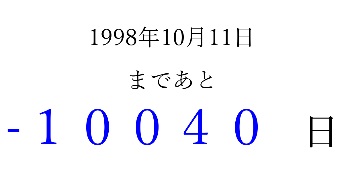 1998年10月11日(日)は もう 00000 日過ぎました 追加すると、トップページからすぐ選べるようになります ※2026/04/07現在の結果です。 最新の状態に更新する ↓シェアして、タイムライン上にカウントダウンを表示しよう!↓ 📤 この結果を共有する Tweet シェア Threads Bluesky 別の日付でカウントダウン 1998年10月のカレンダー このページをブックマークに追加すると、いつでもカウントダウンを確認できます。 (PC: Ctrl+D / Mac: ⌘+D) hitome-notes.comでは以下のページも運営しています。 指定日と期間から日付を計算 | ガチャ確率計算・シミュレーション | プライバシー・ポリシー 運営者:Avocado
