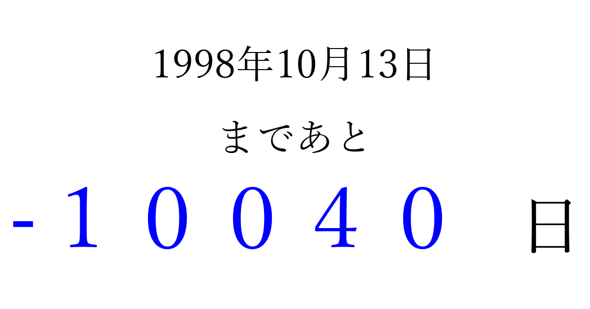 1998年10月13日(火)は もう 00000 日過ぎました 追加すると、トップページからすぐ選べるようになります ※2026/04/09現在の結果です。 最新の状態に更新する ↓シェアして、タイムライン上にカウントダウンを表示しよう!↓ 📤 この結果を共有する Tweet シェア Threads Bluesky 別の日付でカウントダウン 1998年10月のカレンダー このページをブックマークに追加すると、いつでもカウントダウンを確認できます。 (PC: Ctrl+D / Mac: ⌘+D) hitome-notes.comでは以下のページも運営しています。 指定日と期間から日付を計算 | ガチャ確率計算・シミュレーション | プライバシー・ポリシー 運営者:Avocado