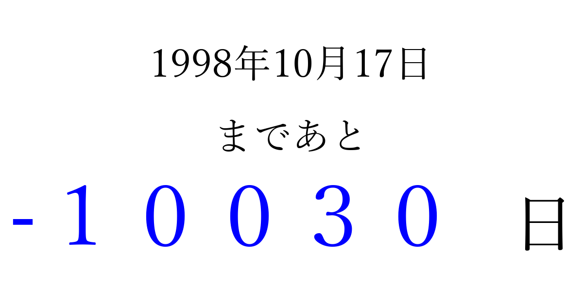 1998年10月17日(土)は もう 00000 日過ぎました 追加すると、トップページからすぐ選べるようになります ※2026/04/03現在の結果です。 最新の状態に更新する ↓シェアして、タイムライン上にカウントダウンを表示しよう!↓ 📤 この結果を共有する Tweet シェア Threads Bluesky 別の日付でカウントダウン 1998年10月のカレンダー このページをブックマークに追加すると、いつでもカウントダウンを確認できます。 (PC: Ctrl+D / Mac: ⌘+D) hitome-notes.comでは以下のページも運営しています。 指定日と期間から日付を計算 | ガチャ確率計算・シミュレーション | プライバシー・ポリシー 運営者:Avocado