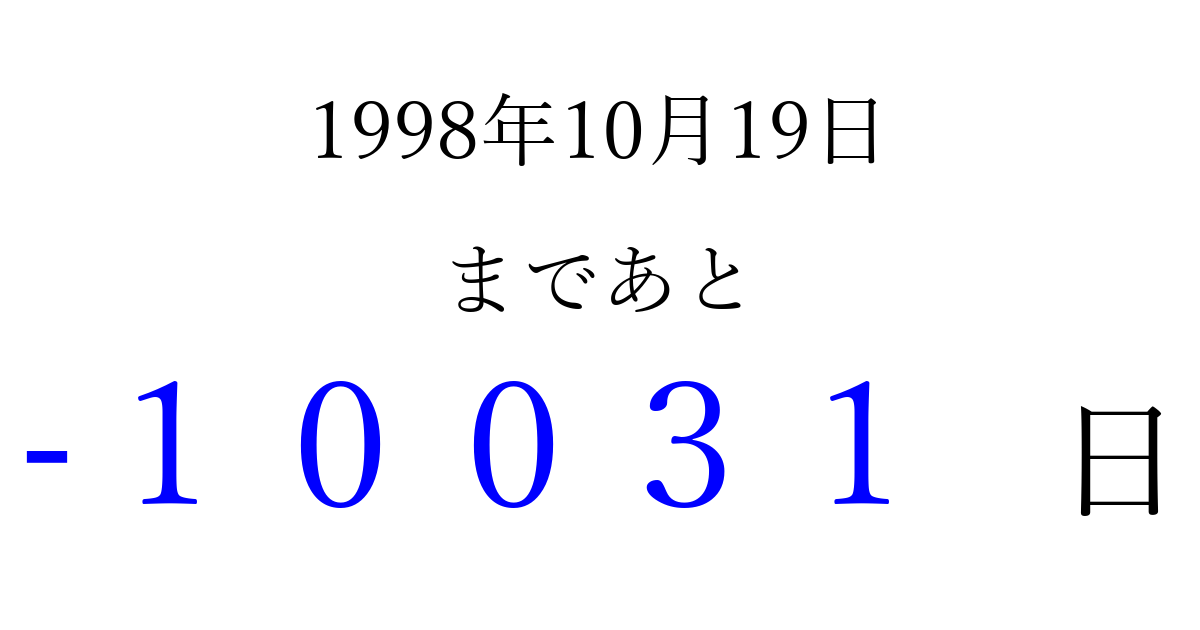 1998年10月19日(月)は もう 00000 日過ぎました 追加すると、トップページからすぐ選べるようになります ※2026/04/06現在の結果です。 最新の状態に更新する ↓シェアして、タイムライン上にカウントダウンを表示しよう!↓ 📤 この結果を共有する Tweet シェア Threads Bluesky 別の日付でカウントダウン 1998年10月のカレンダー このページをブックマークに追加すると、いつでもカウントダウンを確認できます。 (PC: Ctrl+D / Mac: ⌘+D) hitome-notes.comでは以下のページも運営しています。 指定日と期間から日付を計算 | ガチャ確率計算・シミュレーション | プライバシー・ポリシー 運営者:Avocado