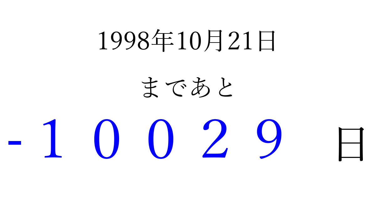 1998年10月21日(水)は もう 00000 日過ぎました 追加すると、トップページからすぐ選べるようになります ※2026/04/06現在の結果です。 最新の状態に更新する ↓シェアして、タイムライン上にカウントダウンを表示しよう!↓ 📤 この結果を共有する Tweet シェア Threads Bluesky 別の日付でカウントダウン 1998年10月のカレンダー このページをブックマークに追加すると、いつでもカウントダウンを確認できます。 (PC: Ctrl+D / Mac: ⌘+D) hitome-notes.comでは以下のページも運営しています。 指定日と期間から日付を計算 | ガチャ確率計算・シミュレーション | プライバシー・ポリシー 運営者:Avocado