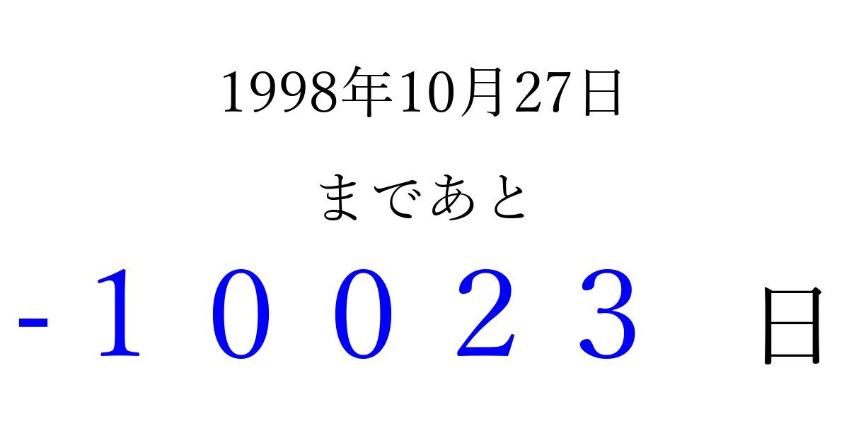 1998年10月27日(火)は もう 00000 日過ぎました 追加すると、トップページからすぐ選べるようになります ※2026/04/06現在の結果です。 最新の状態に更新する ↓シェアして、タイムライン上にカウントダウンを表示しよう!↓ 📤 この結果を共有する Tweet シェア Threads Bluesky 別の日付でカウントダウン 1998年10月のカレンダー このページをブックマークに追加すると、いつでもカウントダウンを確認できます。 (PC: Ctrl+D / Mac: ⌘+D) hitome-notes.comでは以下のページも運営しています。 指定日と期間から日付を計算 | ガチャ確率計算・シミュレーション | プライバシー・ポリシー 運営者:Avocado