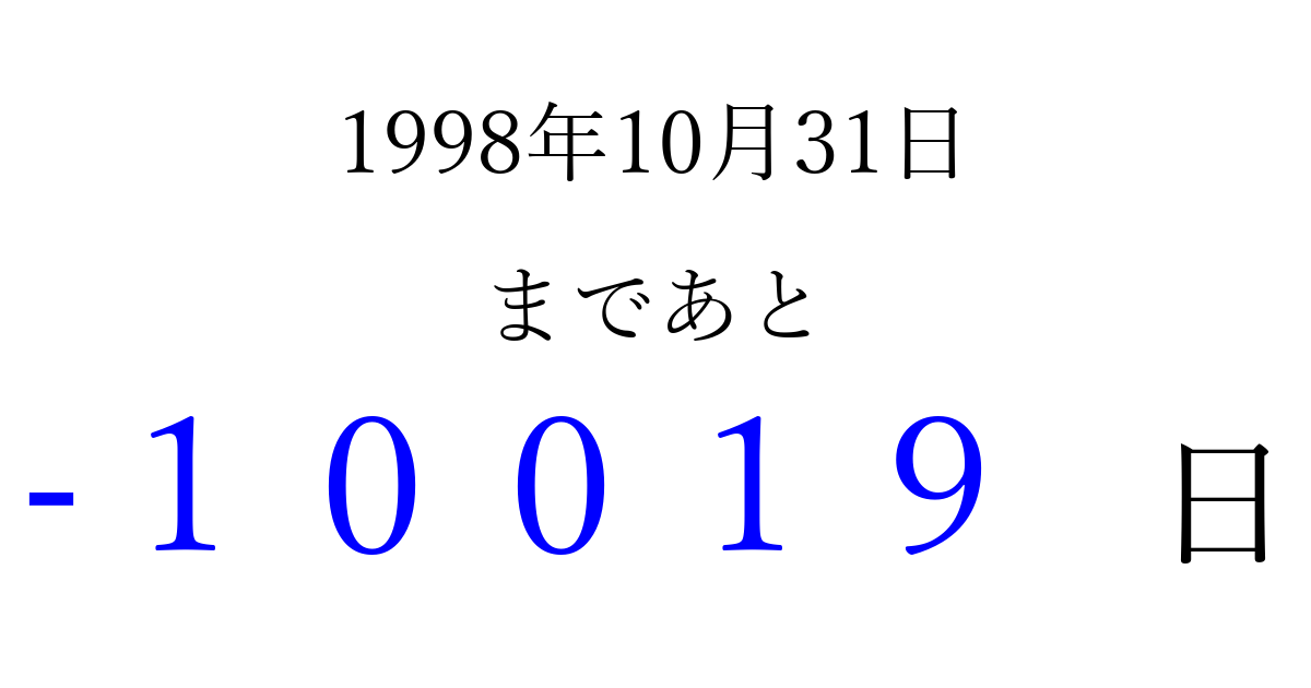1998年10月31日(土)は もう 00000 日過ぎました 追加すると、トップページからすぐ選べるようになります ※2026/04/06現在の結果です。 最新の状態に更新する ↓シェアして、タイムライン上にカウントダウンを表示しよう!↓ 📤 この結果を共有する Tweet シェア Threads Bluesky 別の日付でカウントダウン 1998年10月のカレンダー このページをブックマークに追加すると、いつでもカウントダウンを確認できます。 (PC: Ctrl+D / Mac: ⌘+D) hitome-notes.comでは以下のページも運営しています。 指定日と期間から日付を計算 | ガチャ確率計算・シミュレーション | プライバシー・ポリシー 運営者:Avocado