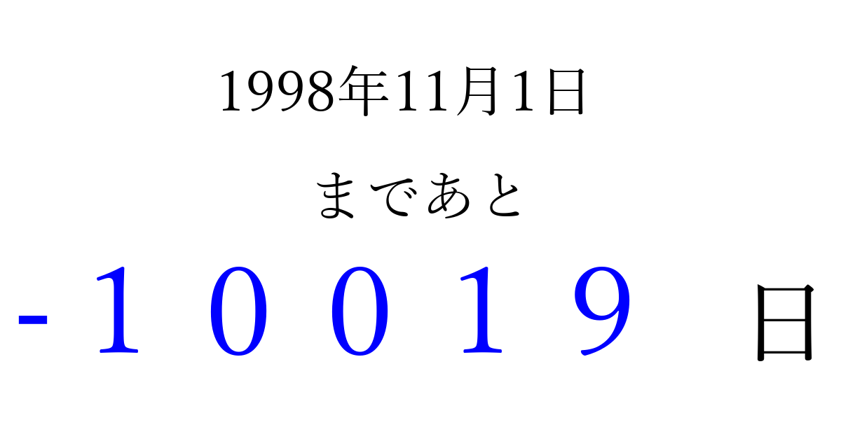 1998年11月1日(日)は もう 00000 日過ぎました 追加すると、トップページからすぐ選べるようになります ※2026/04/07現在の結果です。 最新の状態に更新する ↓シェアして、タイムライン上にカウントダウンを表示しよう!↓ 📤 この結果を共有する Tweet シェア Threads Bluesky 別の日付でカウントダウン 1998年11月のカレンダー このページをブックマークに追加すると、いつでもカウントダウンを確認できます。 (PC: Ctrl+D / Mac: ⌘+D) hitome-notes.comでは以下のページも運営しています。 指定日と期間から日付を計算 | ガチャ確率計算・シミュレーション | プライバシー・ポリシー 運営者:Avocado