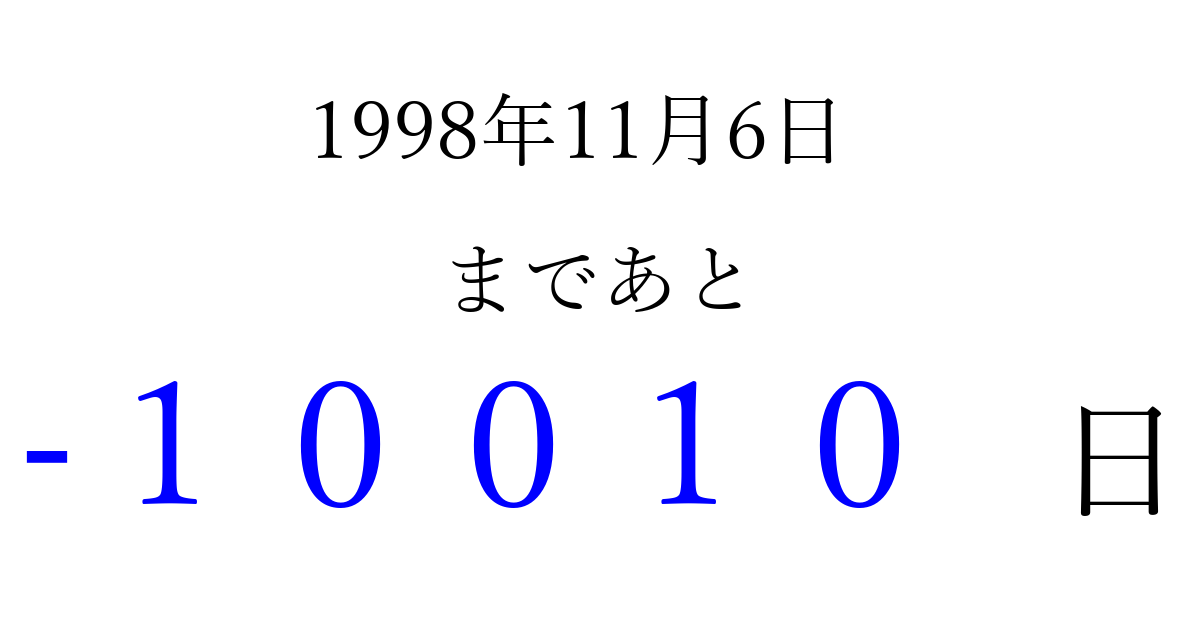 1998年11月6日(金)は もう 00000 日過ぎました 追加すると、トップページからすぐ選べるようになります ※2026/04/03現在の結果です。 最新の状態に更新する ↓シェアして、タイムライン上にカウントダウンを表示しよう!↓ 📤 この結果を共有する Tweet シェア Threads Bluesky 別の日付でカウントダウン 1998年11月のカレンダー このページをブックマークに追加すると、いつでもカウントダウンを確認できます。 (PC: Ctrl+D / Mac: ⌘+D) hitome-notes.comでは以下のページも運営しています。 指定日と期間から日付を計算 | ガチャ確率計算・シミュレーション | プライバシー・ポリシー 運営者:Avocado