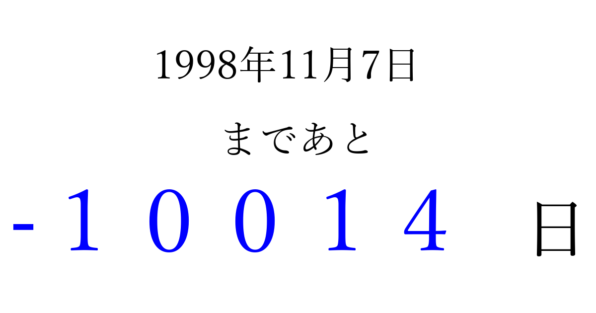 1998年11月7日(土)は もう 00000 日過ぎました 追加すると、トップページからすぐ選べるようになります ※2026/04/08現在の結果です。 最新の状態に更新する ↓シェアして、タイムライン上にカウントダウンを表示しよう!↓ 📤 この結果を共有する Tweet シェア Threads Bluesky 別の日付でカウントダウン 1998年11月のカレンダー このページをブックマークに追加すると、いつでもカウントダウンを確認できます。 (PC: Ctrl+D / Mac: ⌘+D) hitome-notes.comでは以下のページも運営しています。 指定日と期間から日付を計算 | ガチャ確率計算・シミュレーション | プライバシー・ポリシー 運営者:Avocado