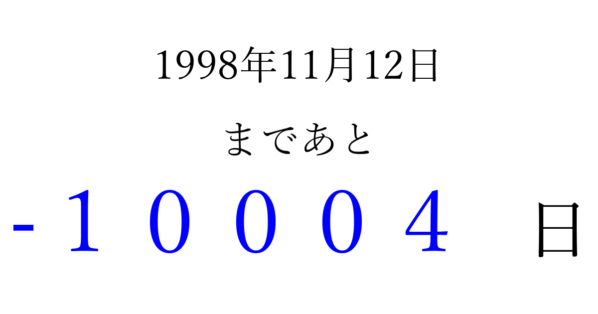 1998年11月12日(木)は もう 00000 日過ぎました 追加すると、トップページからすぐ選べるようになります ※2026/04/03現在の結果です。 最新の状態に更新する ↓シェアして、タイムライン上にカウントダウンを表示しよう!↓ 📤 この結果を共有する Tweet シェア Threads Bluesky 別の日付でカウントダウン 1998年11月のカレンダー このページをブックマークに追加すると、いつでもカウントダウンを確認できます。 (PC: Ctrl+D / Mac: ⌘+D) hitome-notes.comでは以下のページも運営しています。 指定日と期間から日付を計算 | ガチャ確率計算・シミュレーション | プライバシー・ポリシー 運営者:Avocado