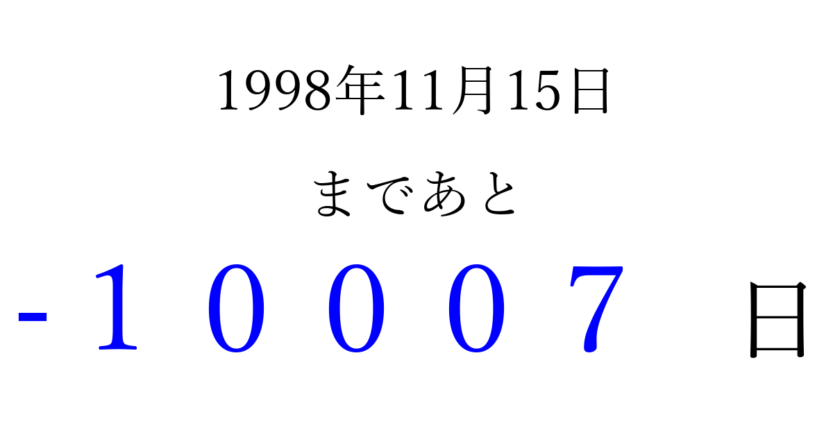 1998年11月15日(日)は もう 00000 日過ぎました 追加すると、トップページからすぐ選べるようになります ※2026/04/09現在の結果です。 最新の状態に更新する ↓シェアして、タイムライン上にカウントダウンを表示しよう!↓ 📤 この結果を共有する Tweet シェア Threads Bluesky 別の日付でカウントダウン 1998年11月のカレンダー このページをブックマークに追加すると、いつでもカウントダウンを確認できます。 (PC: Ctrl+D / Mac: ⌘+D) hitome-notes.comでは以下のページも運営しています。 指定日と期間から日付を計算 | ガチャ確率計算・シミュレーション | プライバシー・ポリシー 運営者:Avocado
